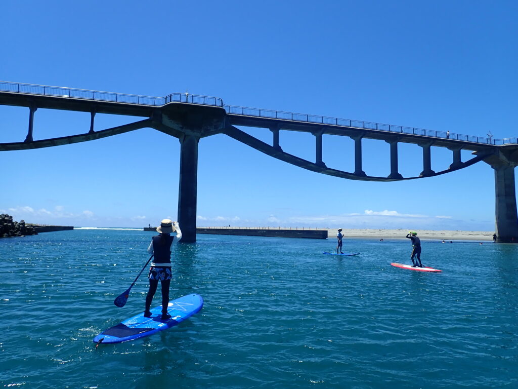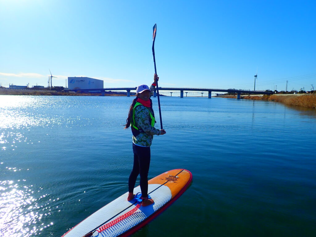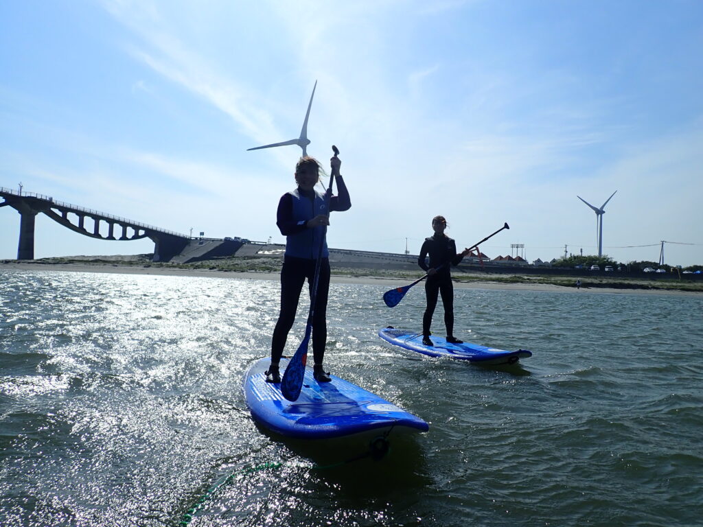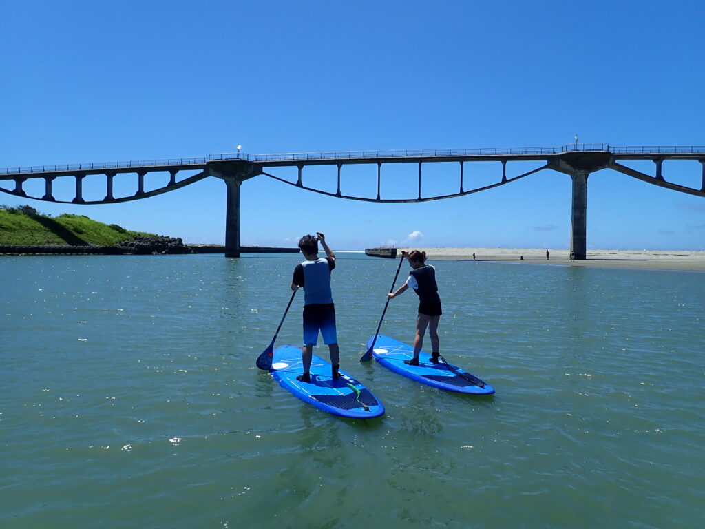 大きなサーフボードの上に立ち、パドルを漕いで遊ぶマリンスポーツです。